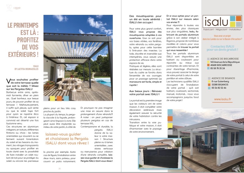 L’Echo du Born, magazine dédié aux lecteurs Landais de Sanguinet à Mimizan en passant par Biscarrosse et Parentis, fait paraître un article sur les produits extérieurs d’Isalu et ses qualités de spécialiste en protection solaire, menuiseries et portails !